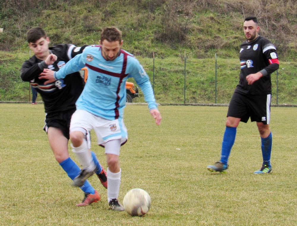 Presentarsi sul campo di Alfedena contro la capolista Ala Fidelis senza la bellezza di ben 7 elementi tra squalifiche e infortuni faceva sicuramente presagire una gara segnata da ogni pronostico e col rischio di tornarsene a casa con la classica "sacchetta". E invece i ragazzi di Panella hanno gettato il cuore oltre l'ostacolo e per poco non sono usciti dal campo abruzzese con un risultato positivo. E il primo tiro verso uno specchio della porta è proprio dei blucerchiati con Cafasso al 7°, ma l'ex di giornata Pellecchia (all'esordio in maglia celeste-granata) para a terra. Poco dopo bella verticalizzazione del colored Diarra per Verlingieri, il cui tiro va fuori di poco. Al 16° è lo specialista Di Giulio a provarci su punizione, ma Quirico è bravo ad alzare sulla traversa. Il Roccaravindola, nonostante le tante assenze, però c'è e al 26° passa anche in vantaggio: è bravo De Chiara sulla sinistra a mettere una bella palla al centro dove Forte appoggia di testa a Cafasso che stoppa bene e di destro batte l'incolpevole Pellecchia. La capolista non riesce a reagire con convinzione e solo nel finale si fa pericolosa con S. Iallonardi che sotto misura manca per poco il bersaglio. Il tecnico dei locali, l'ex Cerrese Domenico Iallonardi, butta nella mischia Tapsoba ed è proprio la fisicità dell'attaccante di colore che cambia il corso della gara. La ripresa si apre con una bella parata di Quirico su un tiro-cross del solito Di Giulio, ma al 54° arriva il pari dei locali con M. Iallonardi (un passato nelle giovanili del Roccaravindola) che dal limite dell'area raccoglie una respinta della difesa e al volo indovina lo spiraglio giusto con un tiro che termina all'angolino alla destra del portiere. Gli abruzzesi cambiano registro e collezionano corner in serie con la difesa blucerchiata che soffre la fisicità dei locali. In un paio di occasioni è Quirico a metterci una pezza, in un'altra è capitan Forte a salvare in acrobazia e in un'altra ancora è la testa di Bove a mandare la sfera ad incocciare la traversa. Al 69° però, sempre su calcio d'angolo, arriva il vantaggio locale per merito di Tapsoba che anticipa tutti e trafigge Quirico da pochi passi. 2 minuti dopo reagisce il Roccaravindola con un tiro-cross dalla sinistra di De Chiara che Pellecchia respinge in tuffo. Con i blucerchiati in avanti, un lungo lancio dalle retrovie sorprende centralmente la difesa con S. Iallonardi che appena entrato in area viene steso da Quirico: rigore che però il portiere ospite riesce a respingere in tuffo a Di Giulio (vedi foto). Nel finale il Roccaravindola ci prova ancora con orgoglio e un cross di Mancini dalla destra per poco non viene sfruttato da Forte che si esibisce in una bella semi-rovesciata al volo, ma la palla termina fuori di poco.