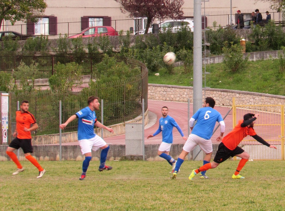 Ancora una sconfitta per il Roccaravindola che nelle ultime 2 gare dovrà recuperare 3 punti per evitare la retrocessione diretta. Ancora problemi di formazione per mister Didone che deve rinunciare anche allo squalificato Camara e agli indisponibili Siravo e De Chiara. Il Real Prata, costruita per l'alta classifica considerando l'organico di prim'ordine, invece con questa vittoria raggiunge la matematica salvezza. Locali in vantaggio già al 14° per merito dell'ex Vulcania Compagnone che si aggiusta la sfera e dal limite di sinistro pesca l'angolino alla sinistra di Podda. Poco dopo la mezz'ora è l'ex Vairanese Fantini a sfiorare due volte la rete, prima colpendo la traversa da dentro l'area e subito dopo costringendo alla grande parata il giovane portiere blucerchiato. Occasione ospite al 38° con un colpo di testa dell'ex di turno Luca Fetta che va di poco fuori. Sul capovolgimento di fronte però arriva il raddoppio locale per merito di Fantini che si inserisce bene in area e fulmina Podda. La ripresa si apre con un'occasione per Chiodi, che tradito da un falso rimpallo sul gibboso terreno pratese, non aggancia a due passi dal portiere. Al 57° netto fallo in area di Bove su F. Pezza e l'arbitro non può non fischiare il calcio di rigore che però lo stesso n.10 locale spara alto sulla traversa (vedi foto). Poco dopo Chiodi da fondo campo mette dietro per Avallone che colpisce al volo, ma la palla sfiora il palo. Al 65° però, sugli sviluppi di un angolo battuto da Del Prete, è Chiodi a risolvere una mischia in area riaprendo la gara (vedi foto). Ma a richiuderla ci pensa ancora Fantini che a centro area, tutto solo, può colpire di testa in modo letale dopo un cross dalla destra. I blucerchiati però non mollano e al 68° sfiorano la rete con un bel tiro dal limite di Michele Cristinzio che il portiere devia in tuffo in angolo. Il goal però arriva poco dopo: gran palla filtrante di Bove per Chiodi che è bravissimo a girare sul secondo palo dove Pezza non può arrivare. Sembra di nuovo riaperta la gara, ma al 70° il neo-entrato Maddalena risolve una mischia furibonda davanti a Podda colpendo di destro e riportando così i suoi sul doppio vantaggio. Il goal carica i locali che poco dopo si portano sul 5-2 grazie alla personale tripletta di Fantini che mette in rete da pochi passi.