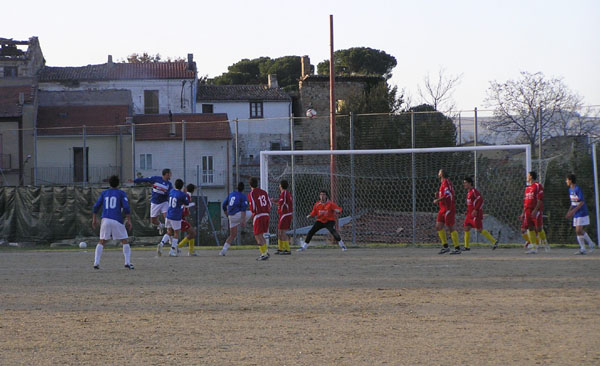 Nonostante un'orgogliosa ripresa, il Roccaravindola non riesce ad uscire indenne dal terreno di una Santeliana alla quale i blucerchiati hanno letteralmente regalato il primo tempo. Mister Berardi deve ovviare ad importanti assenze. Sono fuori causa infatti Sacco, Ritella e i due Castaldi (Elio e Nicandro); nella Santeliana invece squalificato il player-manager Cordone. La gara inizia subito con una protesta di Cambio che cade in area di rigore dopo essere stato toccato da dietro, ma per l'arbitro è tutto regolare. Sul capovolgimento di fronte il campanello d'allarme, per quello che sarà il primo tempo, lo suona l'eterno Olindo Cianciullo che, dopo un bel cross di Totaro, colpisce di testa da pochi passi con la palla che però va alta sulla traversa. Il Roccaravindola non ha un bell'approccio alla gara e soprattutto a centrocampo soffre la prestanza fisica degli avversari e la velocità degli esterni alti. E al 13° la Santeliana segna il "goal della domenica" con Massari che a centrocampo conquista palla, si gira e con un gran tiro da 40 metri manda la palla sotto la traversa. La reazione del Roccaravindola arriva al 18° con Fascia che, su appoggio di Verrecchia, al volo dal limite e di sinistro manda la palla di poco alta sulla traversa. Ma al 39° la Santeliana raddoppia. Un attacco del Roccaravindola viene stoppato dalla difesa di casa che lancia lungo per Totaro che se ne va in velocità e appena entrato in area viene affrontato fallosamente da Pitisci per un netto rigore che Colavita trasforma spiazzando Russo. Mister Berardi allora procede a due cambi inserendo Sisti in attacco al posto di Arena e Chiodi sulla destra al posto del claudicante Cambio. Al 44° il Roccaravindola prova a riaprire la gara con Varricchione che, ben servito da Verrecchia, tenta un diagonale ma Panichella devia in angolo. L'intervallo serve a riordinare le idee e, come accade ormai da un po' di partite, il Roccaravindola torna in campo con un piglio diverso. E dopo soli 2 minuti arriva la rete che riapre i giochi: intelligente sponda di Sisti per Forte che dalla distanza fa partire un fendente che il portiere riesce solo a sfiorare. Sulle ali dell'entusiasmo i blucerchiati insistono e in pochi minuti vanno vicini al pari in due occasioni. Prima con Varricchione che da posizione defilata manda la palla di poco fuori, e poi con Sisti che se ne va in percussione centrale e sull'uscita del portiere sfiora il palo. Insiste la squadra di Berardi e al 69° ci prova ancora Forte, questa volta su punizione, ma para bene il portiere. La Santeliana si vede solo di rimessa con il giovane Totaro che in due occasioni tenta il tiro dalla distanza senza fortuna. I ragazzi di Berardi vogliono però raggiungere il pari e al 74° ci vanno vicini quando Fascia dalla sinistra mette al centro una gran palla per Varricchione che a un metro dalla porta per un niente non la mette dentro. 2 minuti dopo ancora Varricchione pericoloso quando per poco non approfitta di un errato stop in area di Naimo, ma in precario equilibrio manda alto sulla traversa. Il Roccaravindola il pari lo meriterebbe e nei minuti finali cerca il tutto per tutto per scardinare l'attenta difesa locale, che però tiene bene fino al fischio finale dell'arbitro.
