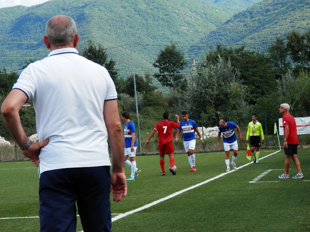 Inizia con un buon pari il campionato di Eccellenza 2014/2015 per il Roccaravindola. Contro una delle grandi del campionato, i blucerchiati, anche se privi di alcuni elementi importanti, hanno disputato una buona gara meritando alla fine la divisione della posta. Mister Iannarelli recupera in avanti Sisti e il giovane Mattia Esposito, mentre al centro della difesa fa il suo esordio il neo-acquisto Cecere, ex Vairano e Matesina. Tra le fila degli ambiziosi pugliesi spiccano le presenze del difensore Rocco Paris, ex Bari in Serie A e Catania e Lanciano in C, e l'attaccante Gianfranco Caggianelli, tanti anni in C con Barletta, Brindisi e Neapolis. Con molta personalità il Roccaravindola non si fa intimorire e al 16° passa già in vantaggio: punizione di Cunti dalla distanza, deviazione di un difensore e Iameo, appostato a centro area, di piatto al volo batte il portiere. Reagisce la squadra ospite che al 19° ci prova con una staffilata dal limite di Pugliese respinta da D'Aguanno, prima del salvataggio di Cunti su Longo. Al 25°, dopo un'azione insistita, è il giovane Russo a girarsi bene in area, ma è bravissimo ancora D'Aguanno che blocca a terra. Al 40° però la Dauna pareggia: gran tiro di Pugliese, respinge D'Aguanno, ma riprende Russo che mette in rete. Nella ripresa la Dauna cerca di fare la partita, ma il Roccaravindola è molto attenta e riparte bene in avanti. Come al 57° quando, dopo un veloce contropiede, Ricciardi mette al centro per Iameo, anticipato all'ultimo momento dal portiere in uscita. All'83° Di Placido lancia Iameo che dal vertice dell'area grande fa partire un gran tiro che Monaco alza sulla traversa con un colpo di reni. E sul conseguente angolo è il giovane Varone a staccare di testa, ma la palla si perde di poco a lato. Finisce così una gara ben giocata da entrambe le squadre con gli ospiti che hanno confermato quando di buono si diceva sul loro conto, mentre il Roccaravindola ha mostrato sensibili progressi in vista delle prossime gare. Un risultato positivo che tutta la squadra e la dirigenza dedica al capitano Pasquale Forte che proprio oggi è convolato a giuste nozze con la sua Anna Maria...Auguri!