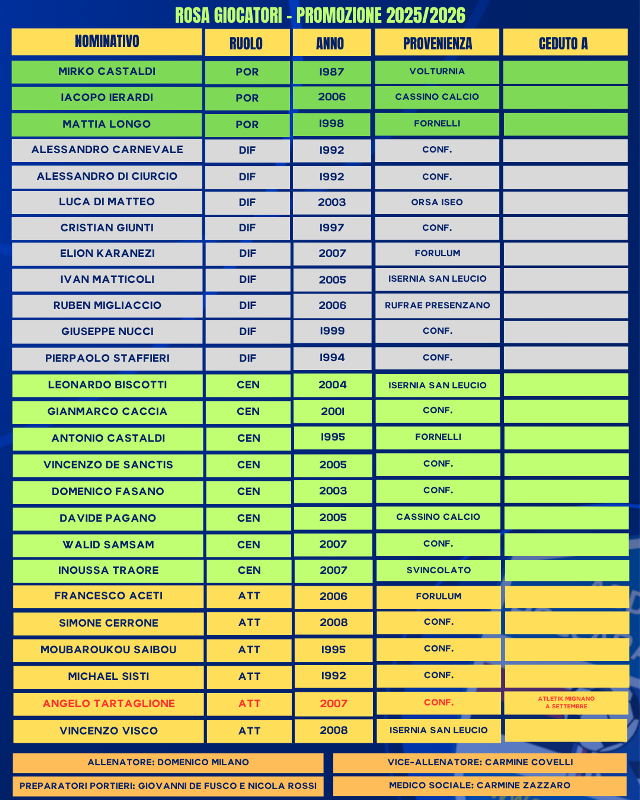 MARCATORI ROCCARAVINDOLA - TABELLINO GIOCATORI ROCCARAVINDOLA