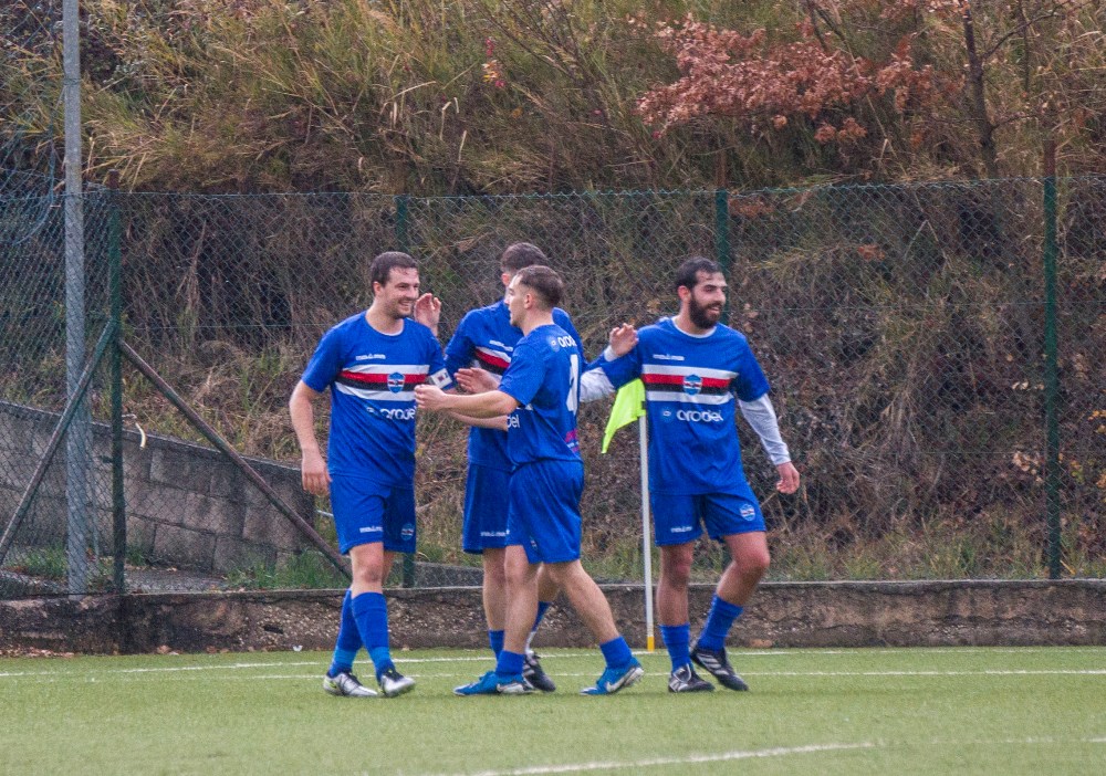 Sisti festeggiato dai compagni dopo il suo goal del 2-0